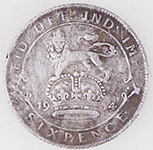 | 18thC crotal bell | 1500-1700 mount | 1920 George V milled silver sixpence | |