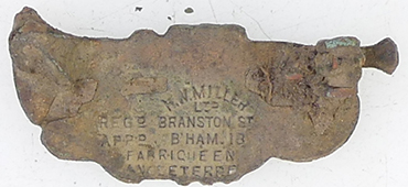 | Victorian silver brooch | 1935 Enameled trumpet badge Button and badge makers, medalists, based 116 & 118, Branstone Street., Birmingham 18; Harold William Miller succeeded founder William Miller in 1935; noted for production of earliest Robinson's Golly brooches |
