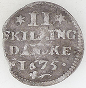1675 Norway Christian V milled silver 2 skilling ObverseCrowned norwegian lion holding an axe, facing left in a beaded ring. Surrounded by inscription. Beaded ring on the rim. Script: Latin Lettering: CHRISTIAN·5·D·G·REX 🟌 Translation: Christian V, by the Grace of God, King. ReverseValue and date on four lines. Mintmark below the date. Beaded ring on the rim. Script: Latin Lettering: Translation: 2 Danish Skilling.