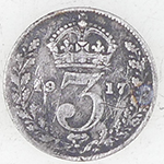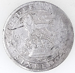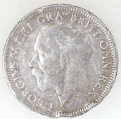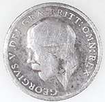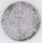| 1914 George V milled silver three pence | 1931 George V milled silver sixpence | ||||||||||||||||||||||||
