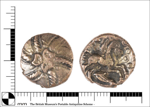 COINUnique ID: ESS-0098CB Object type certainty: Certain Workflow status: Published Description: An Iron Age gold stater of the North Thames Region/ Trinovantes, attributed to 'Addedomaros' and dating to the period c. 45- 25 BC.Addedomaros Spiral type. Six-armed wreath spiral, three crescents at centre. Reverse depicts horse right, cornucopia below, three horse muzzles and inscription [ADDIIDOM] above. ABC 2517, BMC 2404. Measurements: Diameter: 16.96mm; Weight: 5.44g. Discussion: The coin is likely to be an addendum the ‘East of Colchester’ coin hoard and subsequent addenda found from 2005 onwards (see PAS IARCH-81EBCF and de Jersey 2015 no. 61 for details). It now seems likely that the Little Bromley finds represent a series of separate small deposits of staters of Addedomaros spread over several fields. This fits our current understanding of the nature of Iron Age coin deposition, which may involve successive deposits made over periods of decades at significant sites. The coin therefore represents a further addition to deposits at what may be considered a votive hoard site.
