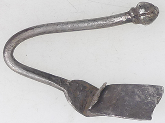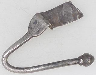 Unique ID: ESS-3985CE An incomplete silver toilet article of probable Roman date (third to fourth century AD). Description: The object is constructed from multiple layers of silver sheet which have been twisted at the centre and fused together at either end. At one end, the object flattens and widens, ending in a transverse break. At the other end, the object flattens and narrows, ending in a rounded point. This has bent so that the end curls inwards. The object is also bent out of shape close to the opposite end. Dimensions: length: 55mm; width: 3.7mm; thickness: 2.7mm; weight: 1.69g Discussion: Toilet articles with twisted bodies are known from Britain and include toothpicks or nail cleaners. Examples are provided in Eckardt and Crummy, figures 107 to 108, particularly nos. 1412 from Canterbury (with a twisted shaft, also in silver) and 938, a copper alloy implement with a similar hooked end and twisted shaft discovered at Wanborough, Surrey. Conclusion: It is therefore likely that this object was at least 300 years old at the time of discovery and, as the object is made of more than 10% precious metals, therefore constitutes potential Treasure under the stipulations of The Treasure Act 1996. Record ID: ESS-BB6FCE - BRONZE AGE penannular ring Unique ID: ESS-BB6FCE