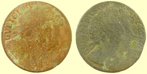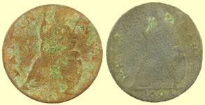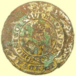 23rd Dec 2008 Have a great Christmas - More find lists and exports I want to take the opportunity to wish all the members and readers of this site a very Merry Christmas and thanks for your continued support. The 2nd half of the season starts early this year on the 4th Feb so not too long too wait to the off again. there are still a few slots free if anyone fancies a hunt, check out the availability page. The exchange rate continues to be excellent as the pound is still under 1.50 to the dollar at the moment making these hunts still over 30% cheaper than last season. I posted a huge batch of export applications off to the MLA today and uploaded more members find lists and pictures to the forum. I am still working on the ID's of outstanding buttons and Michigan Chris posted a neat link of heraldic badges used in Essex that will be of great help, great site Civic Heraldry. The button below is of Harwich origin, not sure what RWM stands for. ARMS: Gules three Seaxes fessewise in pale Argent pomels and hilts Or points to the sinister and cutting edges upwards. Granted 15th July 1932. ARMS: Gules a Portcullis chained Or studded and spiked Azure. Motto 'OMNIA BONA BONIS' - To the good all things are good. Another couple of very early Jetton finds in the pouches I just cleaned up, both are new types for us. Check out the Jetton page. What looked initially like a grotty 19thC copper also cleaned up to be a really neat find, 1790 Halfpenny Masonic Token.