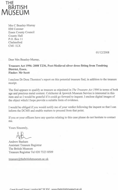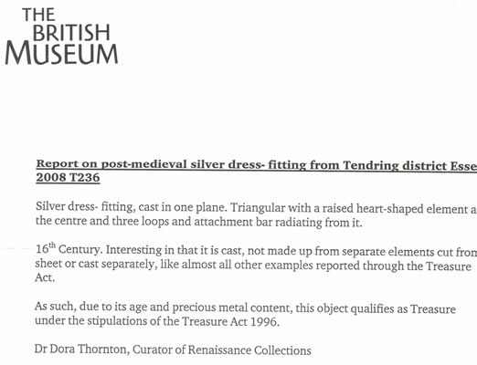 Report for H M Coroner Silver clothing fastener, 17.34mm H x 18.04 mm W, 1.66g - Reported as potential treasure to museum as it could be earlier than it looks - ID'd as Tudor 16th C 'Got my copy today of the British Museum request to the coroner for inquest on my silver dress fitting. Apparently Colchester museum wants it because it is unusual - being cast when most from the 16th century seem to be cut from sheet stock instead.'
