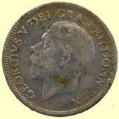 | 1936 George V millled silver half crown (30 pence) | 1936 George V milled silver six pence | ||||||