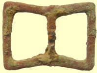 A cast copper-alloy strap-fitting from a medieval horse harness. It is sub rectangular, with a rectangular loop at one end Bridle cheek piece. The square attachment loop suggests an 11th- to 12th-century date Date from: Circa AD 1066 |