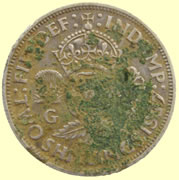 | 1868 Victoria milled silver 3 pence | 1937 George VI milled silver florin (24 pence) | ||