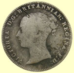 | 1697 William III milled silver sixpence- Chester mint | 1838 Victoria milled silver three half pence (for Colonial use) | ||