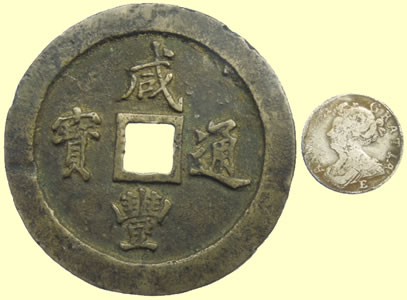 Biggest coin/ trade weight ? I have ever seen. The landowner eyeballed this on their land and I said I would try and get it ID'd. It looks like a Chineses cash coin but it is a monster and 1/8 inch thich. 69.5mm dia, 7mm thick This copper coin worth 100 cash is from the city of Fuzhou in China, the capital city of Fujian Province. It was minted between 1853 and 1855 during the reign of the Emperor Wen Zong (1850-61), of the Qing Dynasty. The Chinese characters on the obverse read 'Xian Feng tong bao'. The characters at the top and bottom, 'Xian Feng', refer to the reign title of Wen Zong, and translate as 'Universal Prosperity'. The character on the right is 'tong', and that on the left is 'bao', and together they mean 'Universal Currency'. The characters on the reverse indicate the value of the coin and where it was minted. The characters to left and right read 'Boo fu', which means the mint of Fuchow. Those at the top and bottom read 'Yi Bai', which show that the coin is worth one hundred cash. |