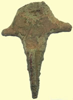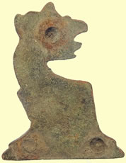Roman military mount A near identical mount is in Benet’s Artefacts second volume, page171 number R09-0403. Described as Mount (Eagle) 50mm. Spread wings with feathers detailed. Mounted on a stem. Perhaps from a military standard. |