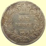 | 1731 George II milled silver sixpence | 1843 Victoria milled silver three pence | ||||||||||