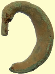 Romano-British protected loop terret 'Protected loop terrets are usually considered to be Roman and dating to the late first and second centuries AD' This Roman terret ring dates to circa 1st - 2nd century AD. Terret rings were attached to chariots, carts or wagons and served as rein-guides. They helped guide in reins from the horses harness to the rider/charioteers hands. This particular type of 'skirted' terret ring dates to the Roman period (more specifically 1st - 2nd century AD). The terret would have been strapped to a wooden yoke, which is a pole fixed to the front of the cart and passed between a pair of horses. Most vehicles would have five terrets; four small side terrets (two for the reins of each horse) and one larger central terret, probably at the end of the yoke closest to the driver, through which the reins would pass. |