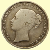 | 1856 Victoria milled silver shilling (12 pence) | 1696 William III milled silver shilling | ||
