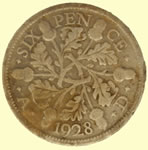 | 1928 George V milled silver sixpence | 1889 Victoria milled silver sixpence | ||