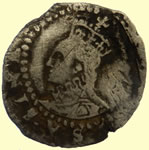 | 16thC Tudor clothing fastener | 19thC livery button | 1679 Charles II milled silver three pence | |