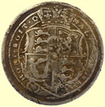 | 1696 William III milled silver sixpence | 1920 George V milled silver florin (24 pence) | ||
