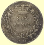 | 1853 Victoria milled silver three pence | 1834 William IV milled silver sixpence | ||