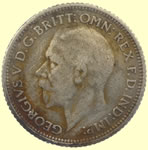 | 1649 Commonwealth hammered silver half groat | 1918 George V milled silver three pence | ||