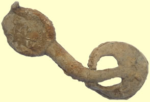 | Medieval barrel tap spout | 19thC livery button | Georgian buckle handle mount | |