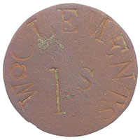 | Medieval bronze lead pot mend | 19thC Colchester & East Essex Co-operative half penny token | ||||||