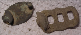 17th/ 18thC Clog and shoe fastenersClogs: Footwear made either completely of wood, or having a wooden sole to which a leather, rubber, or cloth covering may be attached. Until the end of the 18th century, clogs were what the majority of people wore on their feet, as they were inexpensive and protective. The clasps made for use on clogs and shoes were made in two parts: the clasp (the hook side) and the hasp (the cut out section) to take the hooked part of the clasp Clogs or sabots were probably developed from the high wooden pattens worn by ladies of fashion to protect their shoes from the muddy streets between the 16th and 18th centuries. Wooden poulaines were also worn as overshoes in the fourteenth century to protect the delicate fabric footwear. When peasants wore pattens they were called "galoche". These originated in Ardennes and were known in Roman Times. Galoshes consisted of wooden soles, with a leather top. The footwear was serviceable, hardwearing and provided protection from the wet ground. Pattens were made from willow, poplar or any other strong wood, which did not split. They proved popular in the Low Countries and France. There are many references to pattens in contemporary popular literature. Samuel Pepys complained in his diary in 1660 about the poor workmanship of his wife's pattens. The report did not stop Queen Mary II from acquiring five pairs of satin sabots with gold and silver lacing in 1694. Pattens were regularly advertised in the London Gazette and popular with both sexes. Later the character Catherine Morland in Jane Austen's (1775-1817) "Northanger Abbey" records on her trip to the abbey 'wherever they went some pattened girl stopped to curtsey.' This would suggest the servant class as a form of tough footwear wore pattens even if the weather was not inclement. Charles Dickens character, Mrs Perrybingle in 'The cricket on the heath' is described as 'clicking over the wet stones in a pair of pattens that worked innumerable rough impressions of the first proposition in Euclid all about the year.' The early settlers to Brisbane were reported as wearing small clog overshoes to protect their fashionable shoes. The solid leather clogs were for day to day wear with brass nails and horseshoe shaped irons nailed to the soles. |
