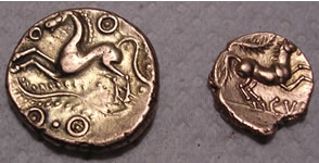 Celtic gold 1/4 stater of the Cunoblein tribe 1stC BC to 40AD.(Biga type) Claudian invasion