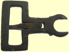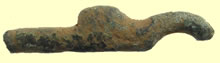 Roman - Cast copper alloy buckle tongue with half of it's loop broken. File marks are evident on the sides and underside. Three incised lines decorate a raised rectangle at the base of the loop - Ref Bishop 186 |