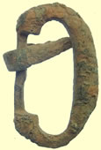 4thC Roman buckle - very unusual type with central iron mounting - seperate bar for attachment of belt 34.81mm L x 30.76mm ESS-F7E490 Roman military buckle An early Roman cast copper alloy buckle. A 'pelta' style buckle associated with the military equipment of the 1st and 2nd century AD, typically used on sword belts. The buckle frame is oval (30.43mm wide), with the terminals curving back in on themselves forming a decorative swirl. The bar is obscured by the pin which is iron and has rusted onto the bar. The remainder of pin has broken off. Attached to the oval frame is a smaller (20.17mm wide) rectangular frame with a grooved pin rest. The colour of the buckle is dark green with rusting around the pin. Cuddeford pages 8 and 9 has parallels, the closest of which is no. 4 on page 9.