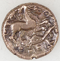 'This is quite a rare type, as you no doubt appreciate. The best parallel is provided by three coins in the British Museum, listed in their catalogue as nos. 3353-55. It's one of a group of coins loosely described as the Snettisham staters, because several of the types were first recognized in one of the Snettisham (Norfolk) hoards of the early 1990s. The exact type is not in Van Arsdell although it's closely related to the North Thames types listed as VA 1500, 1502 and thereabouts. It is presumably an East Anglian type, although because of the stylistic similarities there must have been some very strong link between the producers of the Snettisham types and the North Thames types. Date c. 50 - 40 BC, I think.