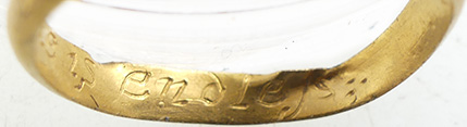 Medieval gold posey ring with full Lombardic inscription and with the flower possibly representing the wound of Christ- working on the legend to dechiper it - Reported as treasure to Colchester museum 22.38mm O/dia x 1.64mm T , 2.77g