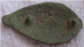 Early Post-Medieval (1500-1700) copper alloy belt mount in the form of an acorn, On the reverse are the remains of the broken attachment spikes. The acorn is flat (1.37mm average) sometimes with a flat collared knop at one end and a sharp extension (broken stem) at the other. It has a flat horizontal rib across the middle. Chronology Broad period: POST MEDIEVAL Date from: Circa AD 1500 |