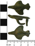 A copper-alloy mount in the shape of a bird in flight with wings, tail feathers and neck extended. The junction of the wings with the body is delineated by two shallowly inscribed grooves on each side of the main body. The neck of the bird is bent upwards and the head and the tips of the wings are missing. Two integral mounting spikes remain in place on the underside of the mount, one beneath the body and one beneath the tail of the bird. The forward spike is bent backwards and the point of the rear spike is missing. The mount has a light green patina. It is 32mm long, 20.6mm wide, and 13.4mm thick. It weighs 6.28gm. There are many examples of Roman brooches depicting birds, usually interpreted as ducks, but most depict the bird swimming, not flying. There are also some mounts such as YORYM-CA2DB0 which has a similar attachment mechanism, and LIN-BE4186, which is a similar shaped bird, with an out stretched neck, , but swimming not flying. Examples of Bird in flight brooches include SF-7EEF01, SF-058774, SF-A01500 and WAW-01E006. The mount is Roman in date