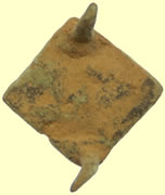 A cast copper alloy Medieval or Post-Medieval mount. The mount is basically square but tapers towards to the top to form a triangle with a projecting knop. In profile the knop is slightly bent back. The face of the mount is inscribed with the letters ‘IHS’ within an incised border which flanks the outside edge of the mount. The underside of the mount has three integral rivets in each corner (the fourth being missing) and its edges are upturned. The mount's patina is mid green and there is a trace of blue above the letter H. Most of the object is covered by light green corrosion product and on the reverse the patina is completely covered either by dirt or corrosion product. The mount measures 32.4mm in length, 23.18mm in width and is between 2.13mm and 3.4mm thick (including the upturned edges). It weighs 7.1g. IHS are the first three letters of Jesus. A comparable mount is illustrated in Read, B. Metal Artefacts of Antiquity, Fig 8, no. 88. This is dated to the 15th century and has a different style of lettering and separate rivets. Length 32.31mm, width 23.52mm, max thickness 2.7mm, weight 7.1g. Chronology Broad period: MEDIEVAL Period to: POST MEDIEVAL Date from: Circa AD 1300 Dimensions and weightLength: 32.4 mm Materials and constructionPrimary material: Copper alloy Manufacture method: Cast Completeness: Incomplete