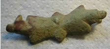 Medieval copper alloy belt mount, 31mm long and 14mm wide. The object is in a fair condition with a green patina and some surface corrosion. It weighs 2.93 grams. The mount is triangular in form and has a central sub rectangular protrusion, 6mm long and 2m wide, on its upper surface. The base of the triangle terminates in a collared knop. There are no signs of decoration but the green corrosion may be traces of enamel? two rivets, 2mm long protrude from its reverse, one above the other. Subsequent actionsSubsequent action after recording: Returned to finder ChronologyBroad period: MEDIEVAL Date from: AD 1100 Dimensions and weightLength: 31 mm Materials and constructionPrimary material: Copper alloy Manufacture method: Cast |