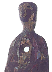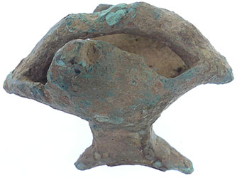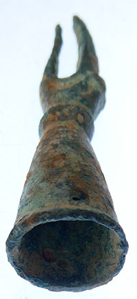 A deep circular hollow in the back of the head is for the attachment of a handle and the break at the neck is where the head would have been soldered to the side of the vessel