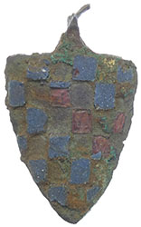 Medieval Harness Pendant Circa 14th century AD. Copper-alloy. A shield-shaped heraldic pendant displaying three lions on a field of red enamel. The arms of England.