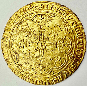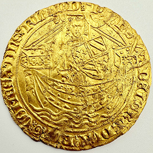 Gold Noble now fixed Flanders, Philip 'de Stoute' (The Bold), 1384-1404, Gold Noble, Monster sized gold noble - almost an exact match as one above but it has a half rose on top of crown, two pellets left, one pellet right to ship front castle - similar legend with double satire stops. 7.9 grams, 31mm