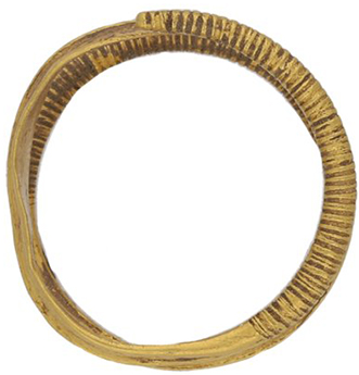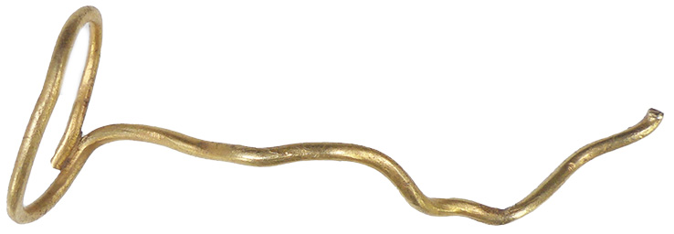 A complete gold penannular ring of Middle Bronze Age date (c.1300-1100 cal BC). Description: The ring is circular in plan, and constructed from two lengths of wire, of D-shaped cross section, fused together. The ends of the ring are straight and end overlaps the other slightly. The grove between the two strands has been worked with a tool. Where the two stands meet on the inside surface, there is a raised seam. One of the strands also has a seam running down the centre of its length and the other, a slightly visible seam. Measurements: diameter: 13mm; width: 5.2mm; thickness: 1mm; weight: 1.85g Discussion: Bronze Age gold pennannular rings constructed from separate wires are usually constructed from circular rods, maintaining a circular cross-section, or C-shaped rods. Those which are D-shaped and flat on the inside, like the example recorded here, are less common, but examples which have also been submitted for the consideration as Treasure include OXON-B69005 (2022T1110); ESS-9DB6CE (2020T1020), both fragments. Complete examples of this form, all constructed with three strands (tripartite) include HAMP-38D723 (2020T623); SF-6CDBFB (2017T200) and NMS-ACBFA4 (2014T3). These have been dated to the Middle Bronze Age (c.1300-1100 cal BC) based on parallels found in Middle Bronze Age contexts. The most closely comparable to the example recorded here is that which was found within in a hoard of objects CORN-705C14 (2020T222) which span the Penard (c.1275-1150 BC) phase of the late Middle Bronze Age to the Ewart Park / Carp's Tongue phase of the Late Bronze Age (c.1000-800 BC). Other examples of multi-strand penannualr rings, including those of circular and C-shaped section have been found as part of hoards dated to the Middle Bronze Age. The Burton Hoard (PAS-5B1745 – Welsh Treasure case 04:02) includes a composite gold penannular ring formed from three round-sectioned wires which have been fused together, with simple clipped or cut terminals. The Cirencester Hoard (BM-28B710 – 2004 T416) includes two double penannular rings and a fragment of a third. Finally, the Granta Fen hoard (British Museum Accession No. 1884,0520) includes several multistranded penannular rings looped around a gold bracelet which was found with an incomplete rapier. It is therefore likely that the penannualr ring recorded here dates to the same period. Conclusion: It is therefore likely that the find was at least 300 years old at the time of discovery. As the object also contains at least 10% precious metal, it constitutes Treasure under the stipulations of the Treasure Act (1996).