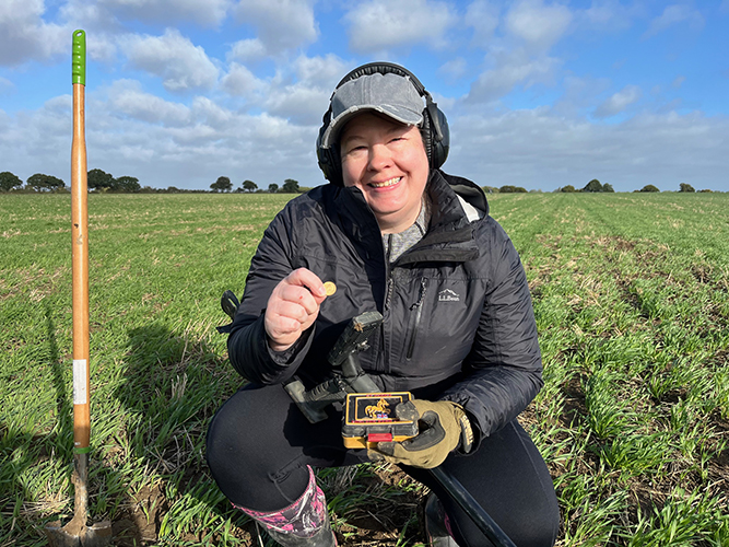 28th Oct 2024 Season break - more great gold findsThat is it now, guys have left until Feb when the 2nd half of the season kicks off. I still have a load more finds the guys left to upload yet to the 2024 Oct finds page. Nc Daisy on her first trip started off with a beauty early decorated gold ring then popped a mint Aethelred II 978-1016 AD Saxon silver penny, the EMC has one other coin of this moneyer in the Crux type, but this is the first single find recorded. She is pictured posing below with the three Colchester club freebies. Mitch Pete again on his first trip popped his first ever Celtic gold coin with 25 BC Clacton Cross type. Updated the gold page with the latest finds.