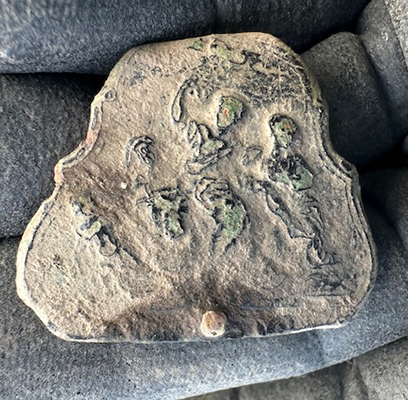 16th Oct 2024 Earliest milled silver found - more beauty relics and club record for coppers foundLots of rain made the ploughed and rolled land very sticky so the guys decided to pick old pastureland for the day. They scored a club record and dug 251 copper coins for the day, a dozen milled silvers, amazing numbers of relics, several hammered silvers and a mint 1775 George III milled full gold guinea pictured below. Because there was no oxygen or fertiliser to attack the copper the coins came out in beautiful shape, early William III and George 1st copper had beautiful patina and dates showing. They returned the following day and got hundreds more coins including over a dozen hammered silver coins and a mint Roman silver. The most spectacular finds were the best looking crotal bells I have ever seen in 20 years. The details on the bells are amazing with one bell showing a double headed lionface below. I will be posting them shortly on the latest finds page. I have created a new hunt page to speed up load times 2024 Oct finds page. I got 10 days of finds to post yet to the new page this week. Stunning crotal bells Henry VIII Posthumous issue?Henry VIII 1509-1547Amazing relic - Henry VIII bronze medallion/ weight ? 4.9g, 27.03mm