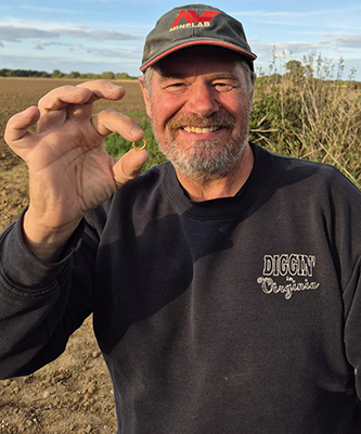 9th Oct - More great mixed gold finds and a blessingThe guys asked Chicago Ronnie to bless their shovels for gold !! The guys are on fire at the moment with some very old gold finds. Chicago Ron did it again with his 26th gold coin find, guys are trying to buy his horseshoe !!He has been a senior member for over 20 years now and runs his own Barn crew. Barn teams are of 7 guys max, have their own mini bus and just pick where they want to search each day from our 300 old fields and farms. It is a great way to run a club as they pick land I would not head to personally given a choice and can come up trumps. They can pick either new land or very old lands we have and can jump around like 'Skippy the kangaroo' and do as many or as few fields of their choice. This week has really paid off for them or they could also have got totally skunked. I have been posting load more great widgets and coins to the latest finds page New 2025 Oct finds page. I have two weeks worth of finds to upload yet to this page. I have also updated the latest gold finds to their own page. Gold finds all page. Fascinating item, Roman figures in black enamel with solid gold rivet. Not been cleaned yet. Googling the item description returned the following result. "Yes, some Roman helmets were decorated with gold rivets or other gold-plated fittings, especially in the later periods of the empire. However, these were not for standard infantry soldiers but for high-ranking officers, cavalry, and ceremonial use."