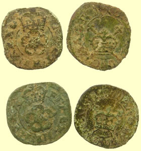 | 1664 hammered copper trade farthing | 1667 ' His half penny' hammered copper trade half penny |